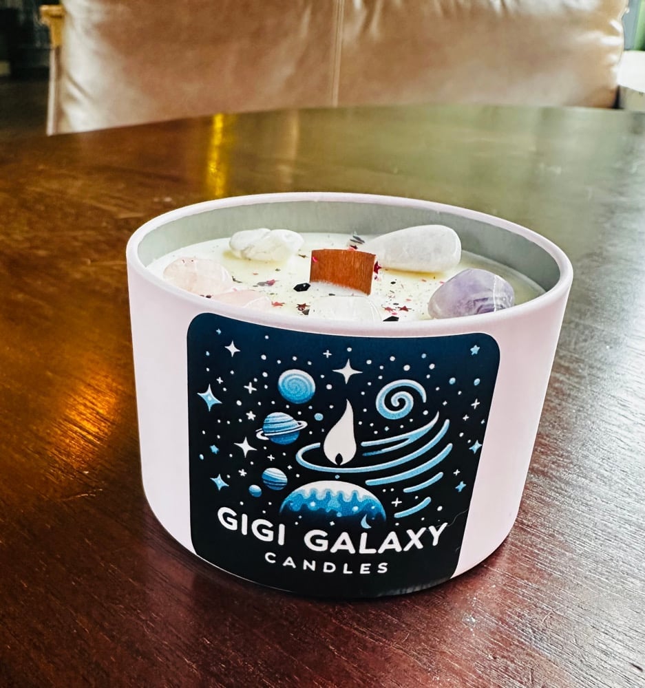 Organic Soy wax, with positive and love intentions crystals, topped off with biodegradable galaxy glitter.