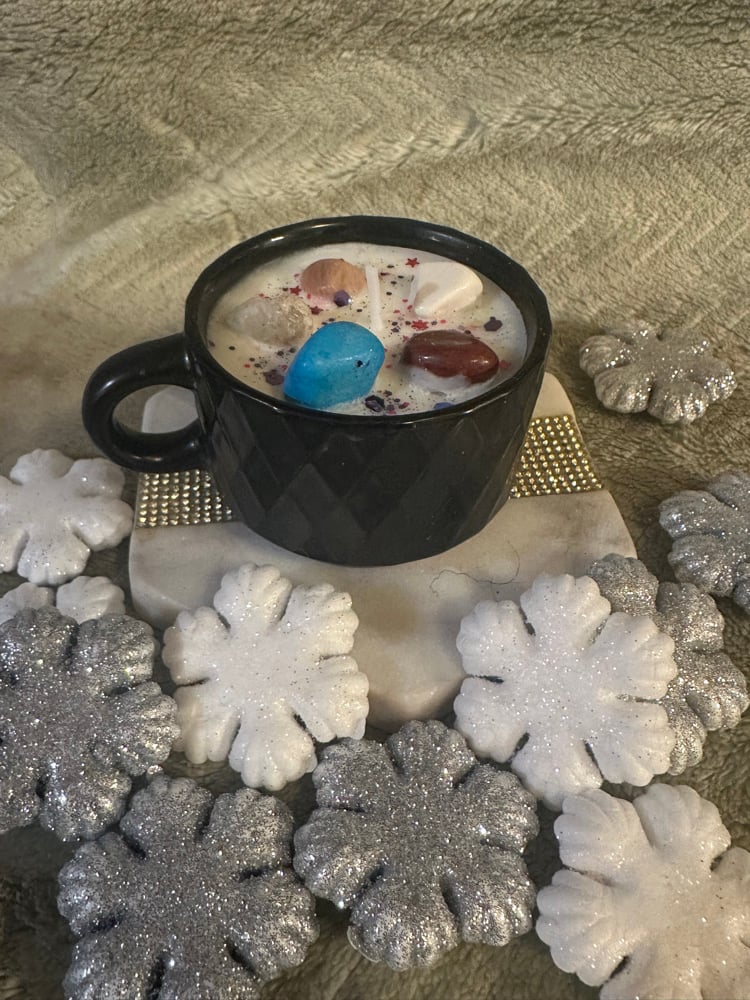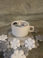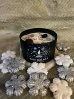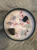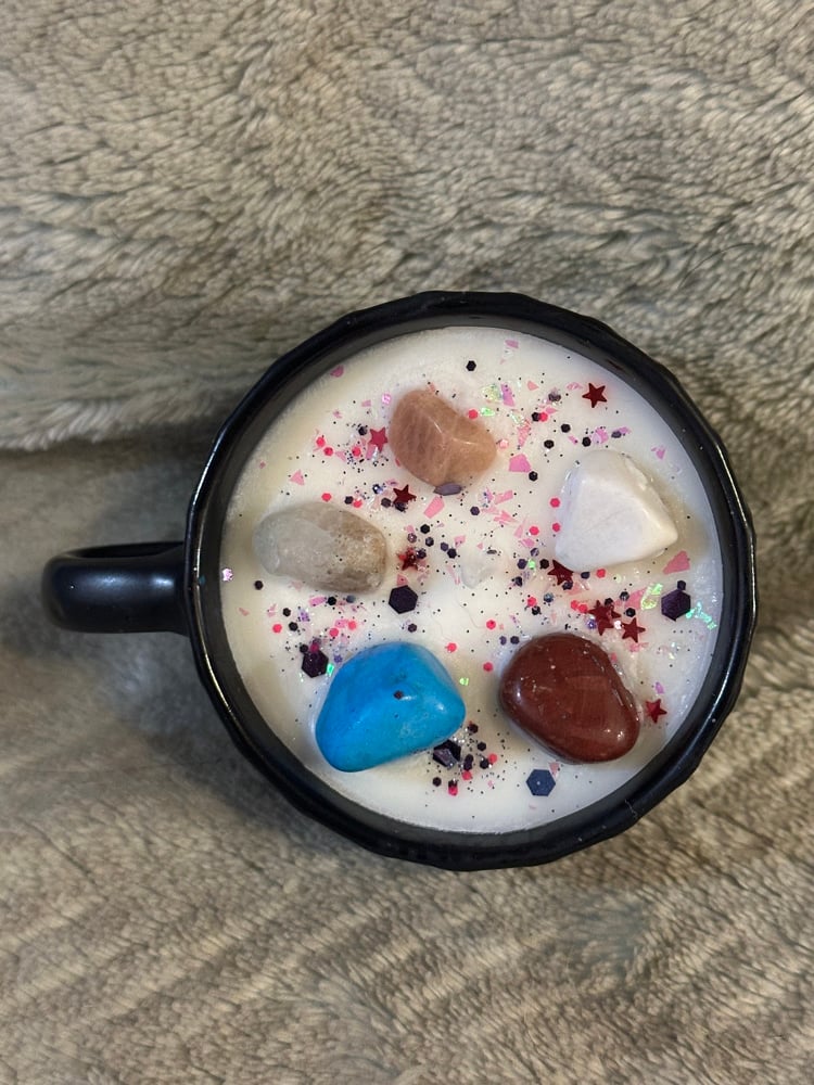 Organic Soy Wax candle with positive vibes crystals and biodegradable galaxy glitter.